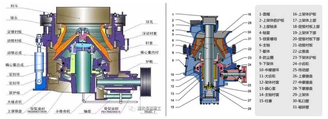 三、过载保护能力不同:单缸圆锥破是通过设定单个蓄能器压力,来提供过载过铁保护;多缸圆锥破碎机则是通过设定多个蓄能器压力来实现过载保护,其锁紧缸压力过大,对过载过铁保护反应不灵敏,且动作周期长。