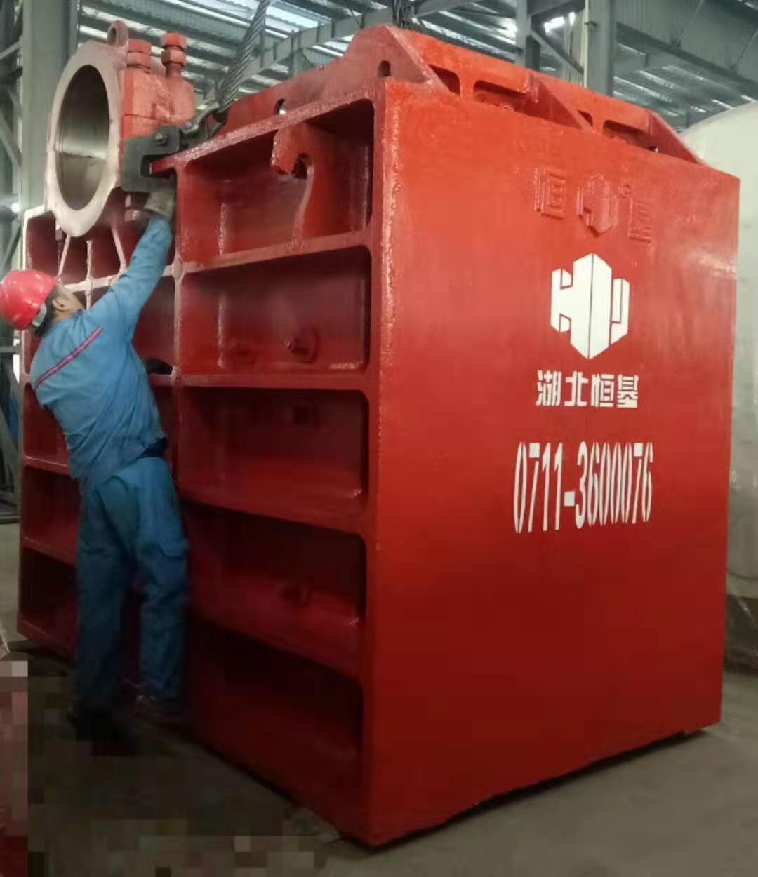 破碎机机架为钢板焊接结构并经退火处理。机架前壁上装有用楔形螺栓固定的固定颚板。在机架内侧装有左、右边护板,以防机架内侧壁的磨损。