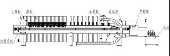 板框压滤机的液压系统主要是提供压力的,当油腔A注油增多时活塞向左运动,压迫滤板使之密闭。当油腔B注油增多时活塞向右运动,滤板松开。
