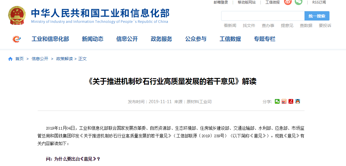 2019年11月04日,工业和信息化部联合国家发展改革委、自然资源部、生态环境部、住房城乡建设部、交通运输部、水利部、应急部、市场监管总局和国铁集团印发《关于推进机制砂石行业高质量发展的若干意见》(工信部联原〔2019〕239号)(以下简称《意见》)。现就《意见》有关内容解读如下:
