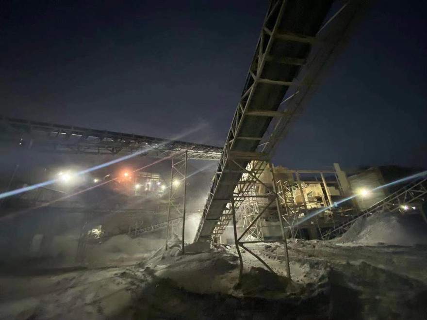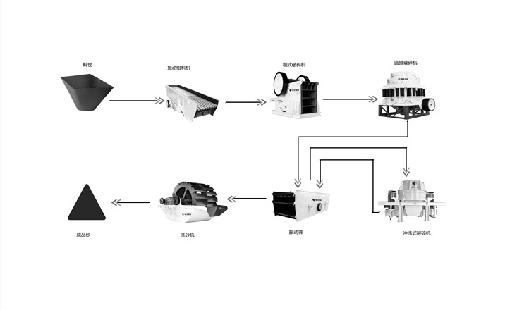 大块花岗岩物料经由料仓到达振动给料机均匀喂料,然后进入颚式破碎机进行第一次破碎,粗碎后的物料经振动筛按要求筛分后,由皮带输送机输送至圆锥破碎机进行第二次的中细碎。经过中细碎后,利用圆振筛进行筛分,较大颗粒物料重新返送到圆锥破再次破碎。符合要求的物料进入到制砂机中进行进一步破碎整形,如物料需清洁,可送入洗砂机进行清洗。最后符合要求的物料根据不同粒度范围进行分类包装。