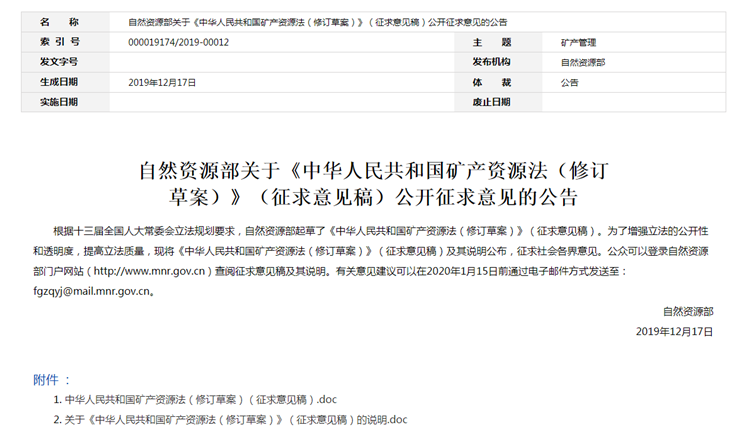 2019-12-25 10:34日前,自然资源部就《中华人民共和国矿产资源法(修订草案)》公开征求意见,要求平等对待各类市场主体,删去关于国有矿山企业、集体矿山企业和个体采矿的不同规定。