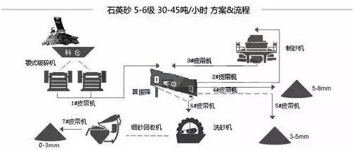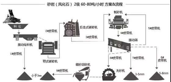 设备配置:料仓+振动给料机+颚式破碎机+反击式破碎机+制砂机+振动脱水筛+洗砂机+细沙回收机+皮带机