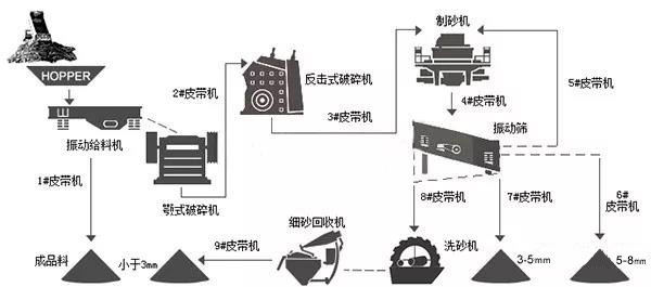 e. 颚式破碎机+圆锥式破碎机+冲击式制砂整形机或制砂系统(常见)。