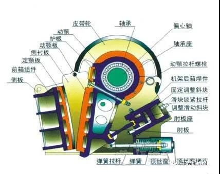 另一对轴承装在动颚与偏心轴之间,通常称为动颚轴承,支承动颚在偏心轴回转时作摆动运动,从而实现活动颚板周期性的靠近与远离固定颚板。