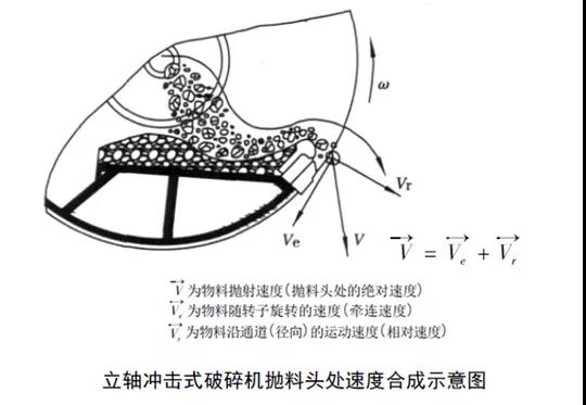 石料在转子中的运动:石料进入分料盘的接触点时的水平速度为零,迅速加速向抛料头(转子外缘)方向的水平运动。石料在抛料头处的速度可根据运动学确定,见下图。