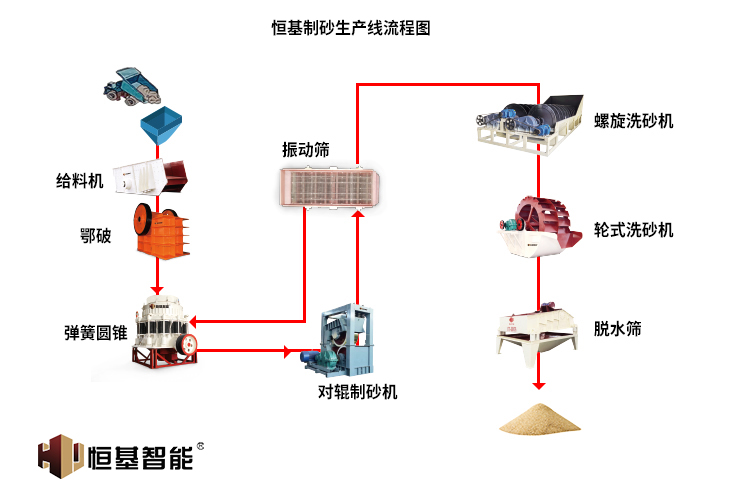 整套制砂生产线主要是由:振动给料机、鄂式破碎机、弹簧圆锥破碎机、立式双辊制砂机、振动筛、双螺旋洗砂机、轮式洗砂机和皮带输送机等设备组合而成。还可根据不同的工艺要求,各种型号的设备进行组合,满足客户的不同工艺要求。
