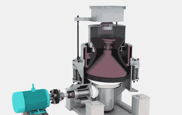 圆锥式破碎机工作是连续性的,利用动锥的偏心运动将石料压碎,同时,由于动锥与固定锥的切向相向运动,石料也要受到剪切碾磨作用,因此,其工作机理是挤压、剪切、碾磨方式的组合。