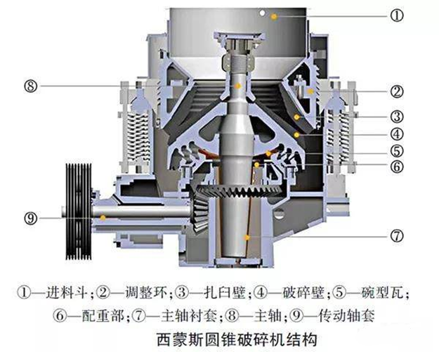 多缸液压圆锥破破碎部件与主轴分离,主轴粗短,直径设计比较大,立于机架上,支撑动锥部,承载能力较强,偏心套可以直接带动动锥来提供破碎力。多缸液压圆锥破是通过液压推手或液压马达来调整驱动环,从而带动调整套在支承套内进行旋转,通过调整定锥螺旋转动上下进行移动达到调整目的。这种调节好处是排矿口容易锁紧。多缸的过载保护是当异物通过破碎腔或超载时,液压保险系统可以将排矿口增大,异物从破碎腔排出,如果异物在排矿口卡住的话可以使用清腔系统,进一步扩大排料口,将异物排出。排矿口自动恢复正常工作。