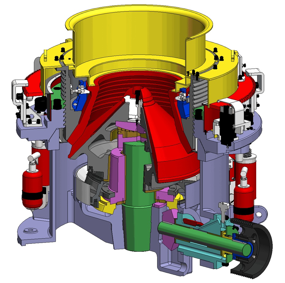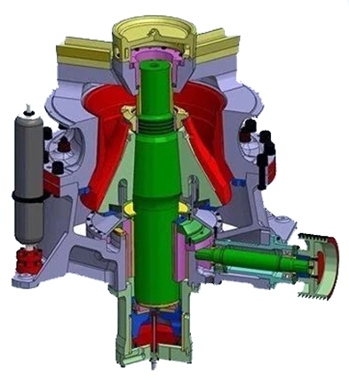 单缸液压圆锥破的破碎部件与西蒙斯类似,它的主轴与传动椎体相组合,由碗形瓦承载,主轴和动锥体相当于底座支撑起来,偏心套可带动主轴提供破碎力。通过油泵对主轴油缸注油或排油,使主轴上移或下移(上下浮动)来调节排料口大小。单缸液压圆锥破结构简单可靠,故障率低,生产成本低,运行稳定性强,维护方便,通过量大,在中碎流程中应用较多,但其针、片状颗粒相对多缸较高,不适合细碎或中碎产品预筛分。