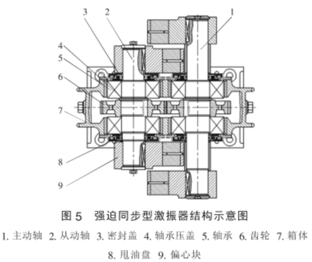 (2)采用1对大螺旋角斜齿轮传动,可严格保证主、从动轴上偏心块的同步性,承载能力强、激振力大、运转平稳,噪声低;