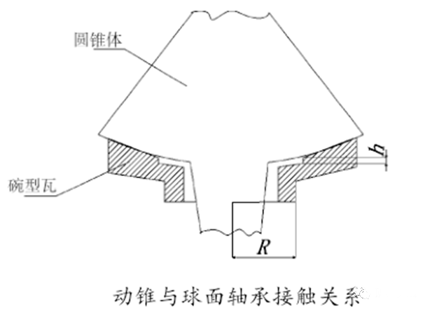为保证圆锥运转正常,必须使整个碗型瓦接触面积的三分之二在外圈,三分之一的里圈与锥面不可接触,使主轴与锥衬套沿锥衬套高度上部接触,在检修破碎机时,观察各接触表面的磨损情况。如果球面轴承与动锥球面不是沿其外圈接触,而是沿其里圈接触,圆锥主轴与锥衬套在下部接触,则可认为飞锥的产生与球面轴承和动锥球面接触不正常有关,主要解决措施有: